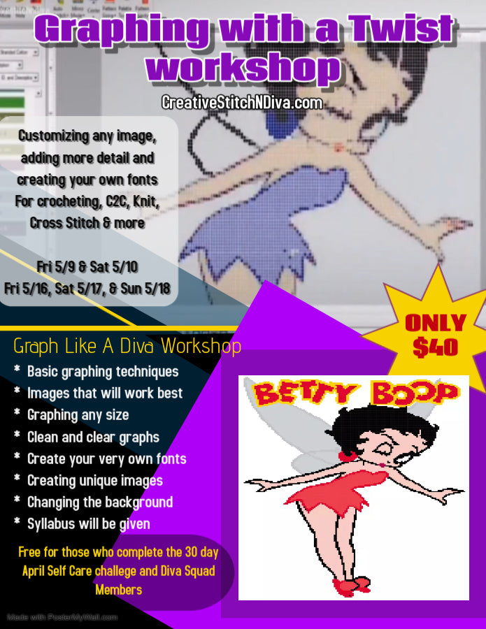 Creative Stitch N Diva, The one and only Graphghan Diva. I design images and create the graph so that it can be crocheted, knitted, cross stitch etc... I am a breast cancer survivor and a mom of 2 boys. I been through it all and today I can say, I regret nothing. That experience helped me to be the warrior I am today. I use this experience to help others and their creative crafts